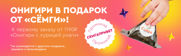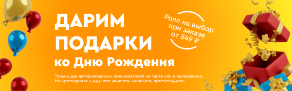 Оформляя заказ на сумму от 1500 рублей (с учетом всех примененных скидок и промокодов), Вы можете получить на выбор ролл "Крабс", запеченный ролл "Крабс", морс клюквенный 0,5 или морс облепиховый 0,5 в подарок!
